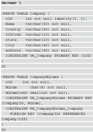 Для распознавания дубликатов на первом этапе мы будем использовать строку, составленную из всех перечисленных атрибутов, общая длина которой может достигать 260 символов. Предположим, что в базе данных имеется 20 000 записей со средней длиной строки 150 символов. При таких параметрах выбираем длину подстроки N = 4. Таблицы для хранения списка фирм и словаря будут выглядеть так, как описано в листинге 1.