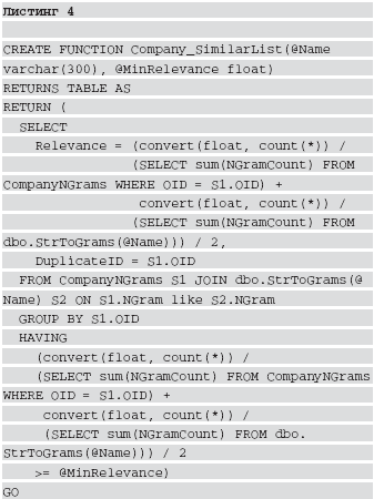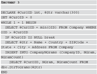 Для первоначального заполнения таблицы множе-ства подстрок CompanyNGrams можно воспользоваться приведенной выше функцией разбиения на грамы следующим образом: