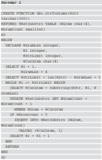 Для первоначального заполнения множества подстрок таблицы CompanyNGrams и последующего ее поддержания в согласованном со списком фирм состоянии (например, используя триггер) нам потребуется функция разбиения строки на подстроки (грамы). Вот пример функции, возвращающей множество подстрок (грамов) исходной строки в виде таблицы: