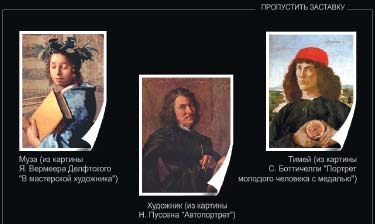 Знакомству с композицией и ее деталями посвящен первый этаж виртуального музея. (Весь учебник представляет собой трехэтажный музей.) Впрочем, определение «учебник» не совсем подходит к данному диску. Это скорее беседы между Музой (с картины Я. Вермеера Делфтского «В мастерской художника»), Тимеем (С. Боттичелли «Портрет молодого человека с медалью») и Художником (Н. Пуссен «Автопортрет»).