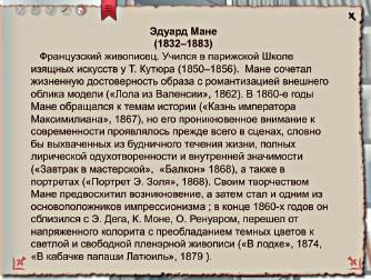 Если первый этаж знакомит с основами композиции, то второй посвящен художественным направлениям: барокко, классицизм, импрессионизм, фовизм… Каждый раздел содержит и дополнительную информацию: рассказ о жизни одного из художников, о судьбе той или иной картины. Порой это видеоролик, порой текст или беседа-лекция. Контрольные задания после каждой темы помогают проверить, насколько хорошо усвоен пройденный материал.