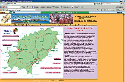 Информация про Ибицу расположена «в двух измерениях». Доступ к одному организован через традиционную горизонтальную панель меню (пункты: «Создатели проекта», «Про Ибицу», «Виды туризма», «Приятное с полезным», «Клубы Ибицы», «Отели», «Обои для Рабочего стола»), располагающуюся в верхней части окна браузера.