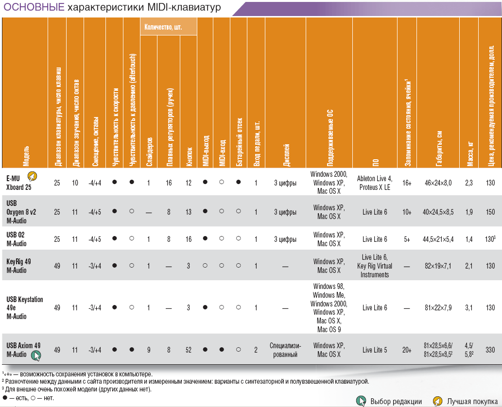 Все приведенные в статье MIDI-клавиатуры имеют интерфейс USB 1.1. Шина этой версии обеспечивает заведомо избыточную скорость передачи, почти в 400 раз большую, чем «родной» MIDI-интерфейс. Понятно, что количество MIDI-сообщений, очевидно, определяется скоростью пальцев музыканта, т. е. по современным «компьютерным» меркам оно совершенно ничтожно.
