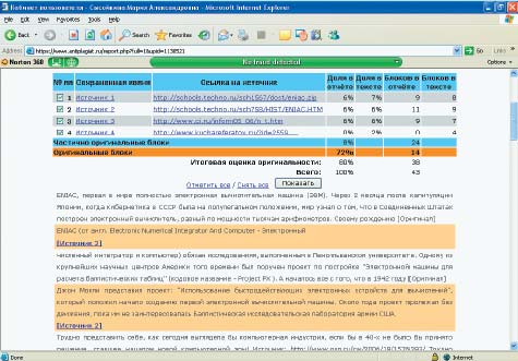 Результаты анализа пользовательских документов представляются в процентном выражении — система указывает процент заимствований и оригинальных фрагментов. Причем для каждого заимствования обязательно указывается его источник.