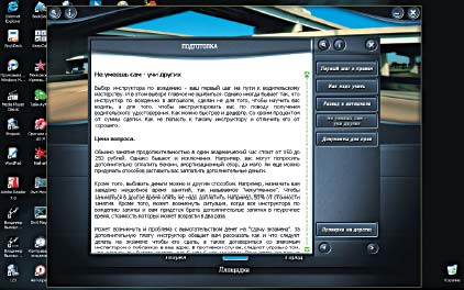 Словом, тонкостей много. Чтобы проверить, насколько хорошо вы все усвоили, в конце «Подготовки» (равно как и в других разделах) существует пункт «Проверка на дорогах». Если результаты теста вас обнадежили, можете переходить к выбору автошколы, а заодно и к другим разделам диска: «Теория», «Площадка», «Город». Здесь вы узнаете, как должны принимать те или иные экзамены (и, значит, о своих правах), а заодно и то, как «валят» на них. Но недаром говорят: «предупрежден, значит, вооружен». Дополнительных сил вам придадут «советы инструкторов», существующие в каждом из этих разделов.
