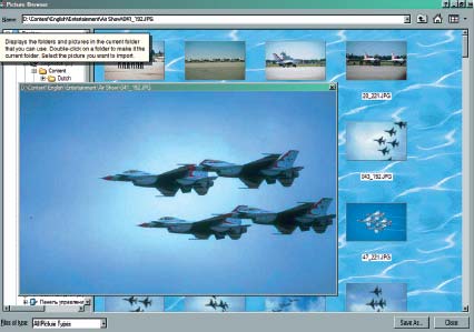 Функциональные возможности этого браузера никак не назовешь исчерпывающими. Скорее наоборот, при работе с изображениями явно не хватает функций пролистывания слайдов, включая режим слайд-фильма. Всякий раз, чтобы посмотреть фотографию, ее приходится «выщелкивать» мышью из общего списка или из набора уменьшенных изображений предварительного просмотра. Такой режим удобен только при целенаправленном поиске изображений. Кстати, этому помогает и отображаемое в левой части экрана программы дерево файловой структуры пользовательского компьютера. Но поскольку названия отдельных фотографий не отражают их содержания (это всего лишь номера), то при отборе изображений ориентироваться приходится сначала на названия разделов и подразделов в левой части экрана программы, а потом использовать картинки предварительного просмотра, расположенные справа.
