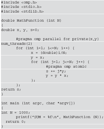 В отличие от операции чтения, которая может быть реализована параллельно и является достаточно быстрой, операция записи всегда последовательна. Следовательно, если сначала первый поток записал новое значение, то второй поток, выполнив после этого запись, затрет результат вычислений первого, потому что оба вычислительных потока сначала прочитали одно и то же значение s, а потом стали записывать свои данные в эту переменную. Иными словами, то значение s, которое второй поток в итоге запишет в общую память, никак не учитывает результат вычислений, полученный в первом потоке. Можно избежать подобной ситуации, если гарантировать, что в любой момент времени операцию s = s + j*y разрешается выполнять только одному из потоков. Такие операции называются неделимыми или атомарными. Когда нужно указать компилятору, что какая-либо инструкция является атомарной, используется конструкция #pragma omp atomic. Программный код, в котором исправлены указанные ошибки, приведен в листинге 3.