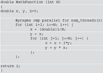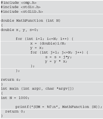 Эта простая программа вычисляет значения некоторой функции. Ее можно легко распараллелить с помощью средств стандарта OpenMP. Добавим одну строку перед первым оператором for (листинг 2).