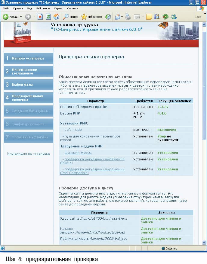 Так что для остроты эксперимента мы заказали подходящий хостинг-план «Эконом» (всего 87 руб. в месяц) в ООО «Аплоадер» (www.uploader.ru ), убедившись, что возможности этого хостинга соответствуют минимальным требованиям БУС. И в этих экономных рамках система «1С-Битрикс» в конечном итоге заработала, после того как мы прошли семь интуитивных шагов инсталляции: «Начало установки», «Лицензионное соглашение», «Выбор базы», «Предварительная проверка», «Создание базы данных», «Конфигурирование», «Окончание установки».