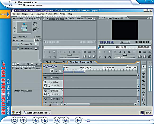 Курс по Adobe Premiere построен на последовательном описании основных окон и инструментов программы. Рассматриваются возможности монтажного стола, импорт и обработка клипов, различные панели и их инструментарий. Отдельные темы посвящены титрам и эффектам. И напоследок — рассказ о сохранении проекта, а также о настройках его параметров и различных возможностей экспорта, как целиком, так и от-дельными частями.