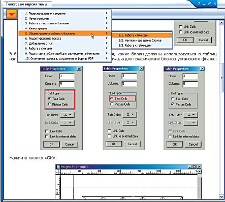 Данные курсы построены на одних и тех же принципах, имеют схожие интерфейсы и структуру информационного наполнения. Из главного окна с помощью кнопки «Начало» вы попадаете в список «Темы». При наведении курсора мыши на название какой-либо из них в свою очередь разворачивается перечень уроков по интересующей вас теме. Выбор любого из них переводит программу в режим его активизации и обучения.