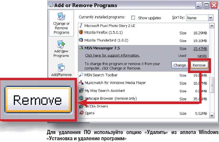 Ретирада. Когда программа не проходит поверки, то попытайтесь избавиться от нее с помощью ее собст-венной опции удаления (ее часто можно обнаружить в меню «Пуск•Все программы»). Если таковой в списке не обнаруживается, выберите опции «Пуск•Панель управления•Установка и удаление программ» («Пуск• Настройка•Панель управления•Установка/удаление программ» в разных версиях Windows, кроме XP), после чего укажите нежелательное приложение из полученного списка и щелкните на кнопке «Удалить» для запуска программы удаления (см. рисунок). Вопреки расхожему мифу, опция «Установка и удаление программ» и ярлык в меню «Пуск» — это просто два различных способа запустить имеющуюся в составе приложения его собственную программу удаления.
