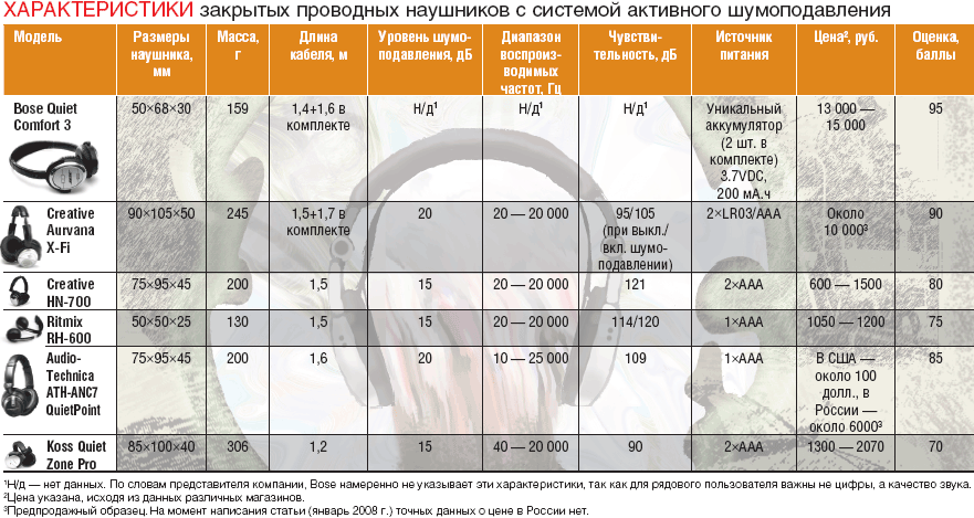 Довольно трудно сравнивать устройства, различающиеся по цене в 25 раз. Поэтому более высокие баллы — отнюдь не рекомендация затянуть пояс потуже, взять кредит на несколько месяцев и купить именно указанное изделие. Но если вы располагаете средствами или готовы все отдать ради качественного звука и объемного звучания видео и игровых эффектов, то Bose Quiet Comfort 3 вне конкуренции. Серьезным минусом, немного снизившим общую оценку этого устройства, стала его высокая цена. Также очень благоприятное впечатление оставила модель Creative Aurvana X-Fi. К сожалению, обе новинки найти в России пока непросто. Отличное соотношение цена/качество продемонстрировало изделие Audio-Technica ATH-ANC7 QuietPoint, опять же пока не получившее распространения в нашей стране. А представитель нижней ценовой категории, малютка Ritmix RH-600, потряс своими компактностью и легкостью при очень хорошем звучании и удобной конструкции.