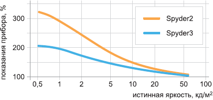 Повторяемость показаний у всех приборов оказалась практически идеальной. Но по мере уменьшения интенсивности измеряемых величин, «Спайдеры» все сильнее отклонялись от эталона: вносимая ими надбавка доходила до 100—200%. Несомненно, Spyder3 значительно превосходит Spyder2 по точности, хотя в абсолютном исчислении все же не тянет на статус «хирургического скальпеля» (см. рисунок).