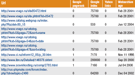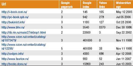 В табл. 1 показаны результаты проверки поисковых параметров первых 10 позиций по запросу «компьютерная литература» в системе Google.