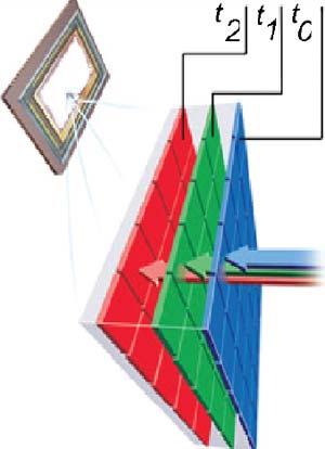 Четвертый слой — слой полупроводниковых лазеров, излучение которых невидимо для глаза. Энергии импульса такого лазера недостаточно для того, чтобы возбудить излучение цветового слоя. Но если подать на него добавочное напряжение, то та точка, на которую попадает луч лазера, в течение определенного времени будет светиться (эффект инерции люминофора)! Задавая разную мощность импульсов, можно добиться формирования на выходе любого цвета. Детали Foveon, естественно, не раскрывает, но показанный работающий прототип размером примерно 1×1,5 см, вероятно, сулит в недалеком будущем новые дисплеи с потрясающим качеством изображения!
