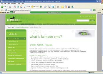 Эта система управления веб-контентом реализована в полном соответствии с принципом Software as a Service. Идея проста: вы платите деньги разработчикам системы и получаете соответствующее количество паролей для доступа к версии с выбранным функционалом. Причем не нужно ничего устанавливать, поскольку все управление структурой и наполнением сайта осуществляется непосредственно из браузера. А компания Komodo предлагает не только инструмент, но и хостинг для сайта. Конечно, можно воспользоваться услугами и других провайдеров или разместить сайт на собственном сервере.