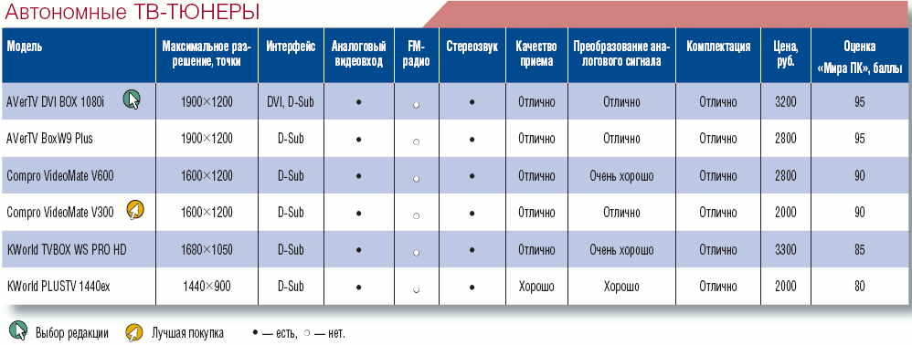 Подводя итоги нашего обзора, хочется отметить, что все представленные тюнеры показали отличный прием ТВ-сигнала и неплохую функ-циональность. Тем не менее, если верить Оруэллу, среди равных всегда найдутся те, которые «равнее». Вот и на этот раз мы решили отдать предпочтение модели AVerTV DVI BOX 1080i, торжественно объявив ее «Выбором редакции». Титул «Лучшая покупка», на наш взгляд, по праву достается тюнеру Compro VideoMate V300 за его богатую функциональность при приемлемой цене.