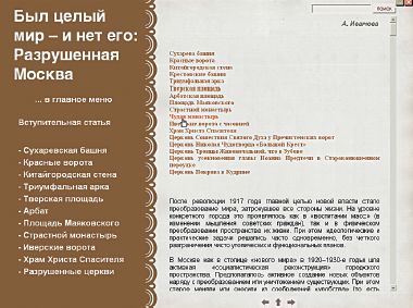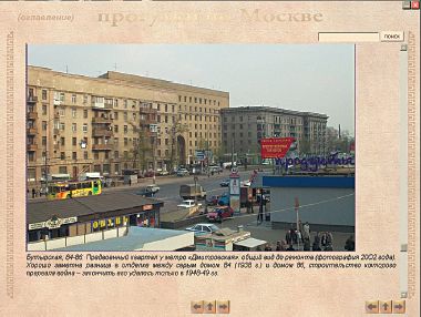 Еще следует посетовать на некую системную нестыковку. Но как объяснить исчезновение Крестовских башен из раздела «Разрушенная Москва»? В «Списке иллюстраций» они есть, во «Вступительной статье» также имеются, даже на диске они присутствуют (!), а вот в фотогалерее их нет. Похоже, разработчики здесь что-то не учли.