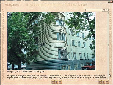 — Ой, а школа, в которой я учился, — также памятник конструктивизма!.. И «угловой магазин», и стадион, на который мы бегали в детстве, чтобы посмотреть на прыжки с парашютной вышки, когда она там еще была… Словом, как тут не вспомнить А.С. Пушкина: «О, сколько нам открытий чудных готовит просвещенья дух!» Просвещайтесь! Покажите гостям «вашу Москву», чтоб не услышать: «а чего вы меня сюда притащили? Я это и по телевизору видела». Пять десятков «прогулок», снабженных полноэкранными иллюстрациями и подробным комментарием, позволят избежать такого вопроса.