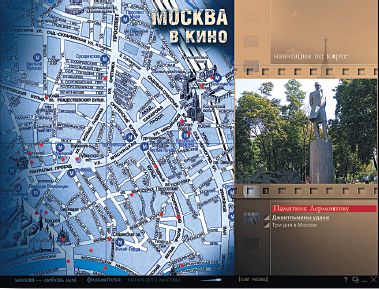 Увы, этой любви, похоже, не хватило на два других раздела: «Фильмотека» и «Кинокарта Москвы». В первом собраны видео-фрагменты из нескольких десятков фильмов, так или иначе связанных с Москвой. Второй раздел — интерактивная карта столицы с отмеченными достопримечательностями, фигурирующими в тех или иных фильмах. Щелкнул на «достопримечательности» — получил соответствующую подборку видеороликов. Но почему, скажите, последние (как и в «Фильмотеке») размером с почтовую марку, пусть и очень большую?! (Кстати, в первом разделе все ролики полноэкранные, точнее, полнооконные.) Отчего некоторые эпизоды обрываются задолго до логического конца, отчего иногда становятся невнятными? Наконец, чем объяснить то, что в одних фрагментах при максимальной громкости слова еле слышны, а в других даже изначально заданный 50%-ный уровень громкости заставляет убавить звук?