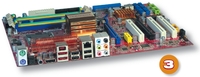 Одно из гнезд SerialATA выведено на заднюю панель. А место параллельного порта занимает решетка радиатора, установленного на силовых элементах преобразователя напряжения: воздух от процессорного вентилятора проходит мимо ребер радиатора и направляется поверх гнезд USB, IEEE 1394 и SerialATA. Если же для охлаждения процессора используется пассивный или жидкостный теплоотвод, то в комплекте имеется вентилятор, монтируемый на этот радиатор.