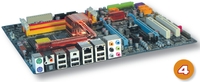 Отказ от стандартных выходных разъемов (2×COM + LPT) позволил разместить на задней панели сразу восемь гнезд USB, а также две сетевые розетки и два гнезда IEEE 1394 — обычное пятиугольное и mini. При этом общее количество гнезд USB достигает 12. В то же время на плате еще остался разъем для параллельного порта, так что если возникнет потребность подключить к компьютеру старый принтер или другое устройство, это можно будет сделать, установив в корпус монтажную скобу с соответствующим разъемом.