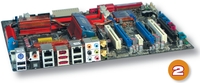 Изюминка этой платы — возможность использования одновременно трех видеокарт для формирования изображения, так называемая технология «3-way SLI». У платы есть три полноценных гнезда PCI Express x16, причем два из них — второй и одно — первой версии.