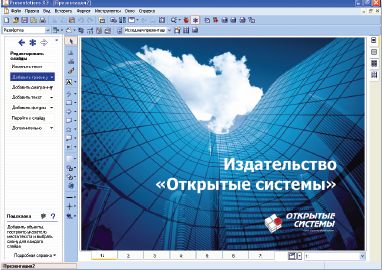 Программа предоставляет довольно много макетов и эффектов для создания собственных слайдов, а вот фоновых изображений имеется всего пять. Впрочем, это не так уж важно — многие ли из нас используют стандартные фоны? Вряд ли. Например, чтобы создать корпоративную презентацию, лучше иметь собственный стиль оформления, отвечающий принятой в компании цветовой гамме и символике. На слайды позволительно добавлять таблицы и диаграммы, видео, звук, изображения (в том числе анимированные), поля данных и многое другое.