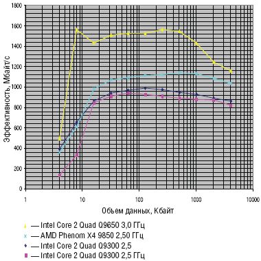 При передаче данных блоками по 64 Кбайт явное преимущество наблюдается у процессора AMD, который обходит даже наиболее мощный процессор Intel. При этом преимущество над четырехъядерными процессорами достигается за счет того, что не происходит обращения к основному объему оперативной памяти, а над E6700 — банально за счет количества ядер.