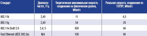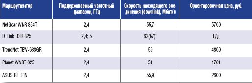 Измерения проводились следующим образом. К исследуемой точке доступа по проводному Ethernet подключался компьютер на базе процессора Intel EE 955, ОЗУ 1 Гбайт и жестким диском WD4000КВ, работающий под управлением Windows XP SP2. С помощью беспроводного соединения к точке доступа подключался ноутбук Acer TravelMate 3300, работающий под управлением Windows XP SP2, оснащенный процессором Intel Pentium M 1,7 ГГц, ОЗУ объемом 512 Мбайт и жестким диском Hitachi TravelStar 4K120. Скорость соединения определялась с помощью пакетов Netperf (http://www.netperf.org/) и IXIA IxСhariot (www.ixchariot.ru). Для оценки производительности беспроводной сети измерялась скорость передачи нисходящего потока данных (downlink) TCP/IP от стационарного компьютера к ноутбуку. Скорость нисходящего соединения при подключении компьютеров по сети Ethernet 1 Гбит/c составила порядка 350 Мбит/c. При настройке точки доступа выбирался частотный канал, наиболее удаленный от других источников сигнала и соответственно обеспечивающий максимальную пропускную способность. Для исключения возможного влияния расположения точки доступа на плоскости и других случайных факторов каждое измерение проводилось 20 раз. Тем не менее демонстрируемая в каких-либо конкретных условиях скорость может заметно отличаться от приведенных в таблице значений.