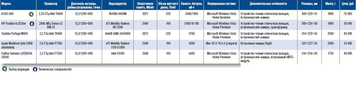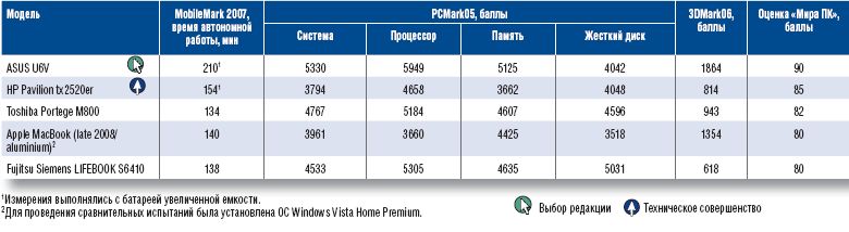 На сей раз мы решили воздержаться от присуждения традиционного титула «Лучшая покупка», потому что, на наш взгляд, среди протестированных экземпляров нет ни одного аппарата, который можно было бы безоговорочно рекомендовать приобрести основной массе наших читателей. Значок «Выбор редакции» заслужил ASUS U6V как наиболее «продвинутый» ноутбук, обладающий неплохими характеристиками при минимальной цене, а новую редакционную награду — звание «Технологическое совершенство» — получил HP Pavilion tx2520er, ведь он, как говорится, «и швец, и жнец, и на дуде игрец».