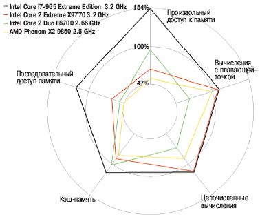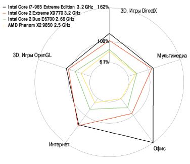 Пользуясь штампом, можно отметить, что «новый процессор Intel продемонстрировал невиданную ранее производительность», обогнав предшественников почти по всем параметрам (опять déjà vécu?). А может, и по всем — сказать трудно: производительность в офисных и интернет-приложениях вычислялась по разным методикам для двух «экстремальных» процессоров Intel, поэтому незначительный проигрыш нового процессора в интернет-приложениях может быть связан с методической погрешностью.