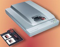 Среди представленных моделей этот аппарат выделяется прежде всего высокой ценой, поскольку предназначен в основном для продвинутых фотолюбителей. Судите сами: устройство оснащено полноценной ПЗС-матрицей, обеспечивающей большую глубину резкости, и имеет расширенные возможности работы с пленочными носителями, позволяя сканировать не только образцы привычных размеров, но и среднего формата. Держатели выполнены очень неплохо, например, можно за один раз отсканировать две полоски пленки по шесть кадров. При сканировании с разрешением 1200 тнд это занимает около 14 мин. Для экспонирования образцов здесь использована новая светодиодная подсветка. И если для сканирования в отраженном свете ее мощности вполне хватает, то при работе с прозрачными материалами явно ощущается недостаток освещения. Для устранения дефектов пленки — мелких царапин, пыли — используется технология, встречающаяся в профессиональных моделях. Суть ее состоит в использовании инфракрасной подсветки, позволяющей выявить и составить карту дефектов изображения и в дальнейшем программно удалить их. Драйвер устройства выполнен на очень высоком уровне, обеспечивая все необходимые в работе настройки, да и простой режим будет понятен и ребенку. Важной особенностью является наличие функции конвейерного сканирования, благодаря чему можно значительно увеличить скорость перевода необходимых материалов в цифровой вид. Чтобы избежать повреждения при транспортировке, производитель предусмотрел фиксатор оптической головки.