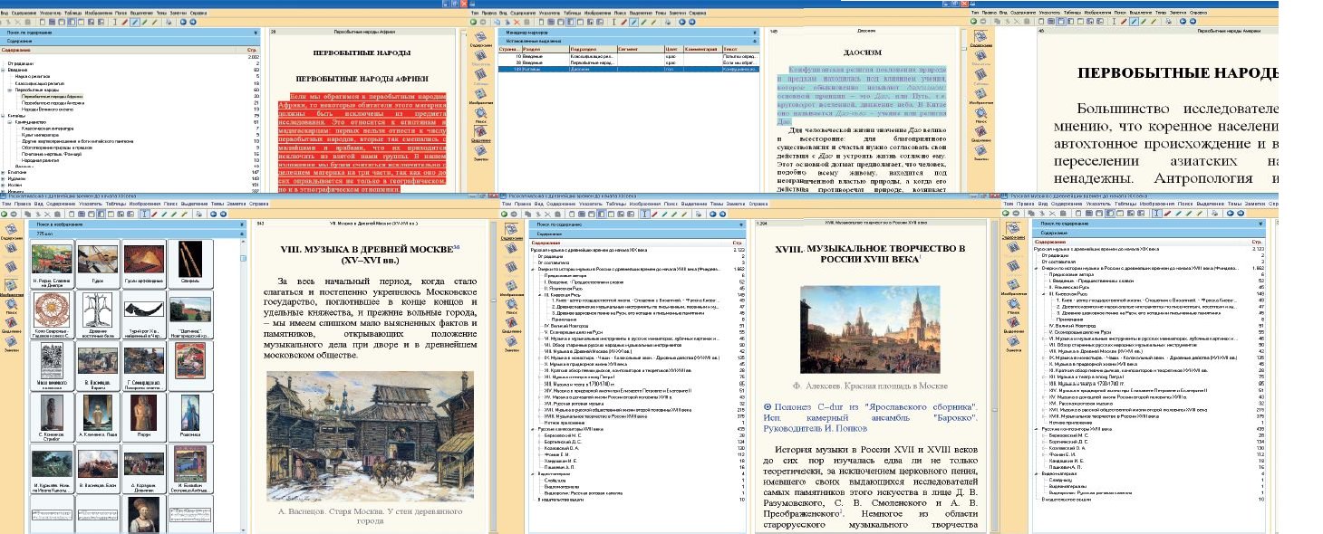 В «стандартном» режиме просмотра экран разделен на две части: содержание (которое легко заменить списком иллюстраций) и «рабочая» статья. В зависимости от пристрастий и целей можно одним щелчком мыши изменить его на «половинный» или на «двухстраничный». Поисковая система позволяет находить требуемое как по содержанию, так и по полнотекстовому режиму. Причем в последнем случае операнды «и/или» позволяют производить довольно сложные запросы.