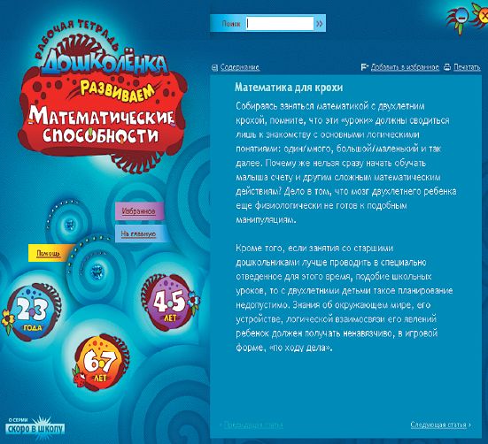 Продукт «Развиваем математические способности» предназначен для тех, кому от двух до семи. Но не волнуйтесь, вашему малышу не придется возить мышью, чтобы отметить правильный ответ (это же не ЕГЭ!). Данная программа по сути та же книга, только нужно листать не бумажные страницы, а электронные. Наш совет: независимо от того, в каком возрасте вы будете приобщать к ней ребенка, прочитайте в разделе «2—3 года» статью «Математика для крохи». (Назвать этот текст «статьей» (см. илл.), конечно, преувеличение, но познакомиться с ним будет весьма полезно.)