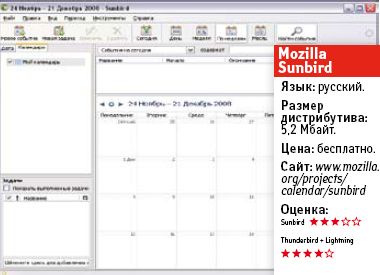 Данный продукт пока еще далек от идеала. Фактически он предоставляет очень мало необходимых функций. После установки коробочной версии получается просто аналог календаря Outlook. Приложение Sunbird даже не умеет сворачиваться в трей, что для подобной программы считается стандартом. Кроме того, и загружается, и работает оно довольно медленно. Обусловлено это, видимо, тем, что программа основана на XUL (XML User-interface Language, подмножество языка XML, используемое для описания интерфейса). Зато она совершенно бесплатна.