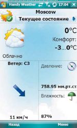 К сожалению, из российских городов в программу включены только самые крупные, видимо, из-за того, что Handy Weather ориентирован в основном на пользователей из Европы и США. Прогноз погоды предоставляет компания Intellicast. К сожалению, ее данные, вероятно, также рассчитаны более на западного потребителя, поэтому нередки случаи, когда Handy Weather предсказывает у нас солнечную погоду, в то время как за окном идет дождь. Цена же продукта даже выше, чем у более удачного и красивого Spb Weather, — 495 руб. Такую сумму не каждый захочет выложить, особенно учитывая малый охватнаших городов и недостаточную точность сведений.