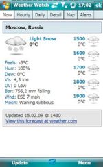 Программа Weather интегрируется с другими продуктами Spb Software (Mobile Shell, Pocket Plus, Diary), что весьма удобно. Например, допускается сделать вкладку в Pocket Plus для прогноза, чтобы сэкономить драгоценное пространство дисплея.