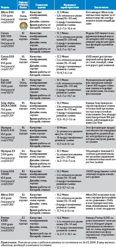 В наш рейтинг не вошла модель Panasonic Lumix DMC-G1 (продаваемая за 800 долл. в комплекте с объективом, фокусное расстояние которого варьируется от 28 до 90 мм). Она не относится к классу традиционных зеркальных камер, но может использоваться со сменными объективами.