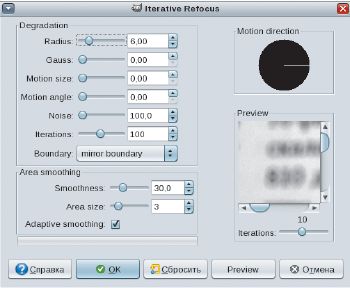 Radius — радиус, по которому будут «подкручиваться» точки относительно друг друга (таким образом Refocus пытается вернуть резкость). Радиус подкручивания (также называемого конволюцией) — самый важный элемент при восстановлении резкости. При несильном размытии подойдет его значение по умолчанию, равное 1. Если же изображение размыто сильно, то величину радиуса нужно увеличить, подбирая вручную.