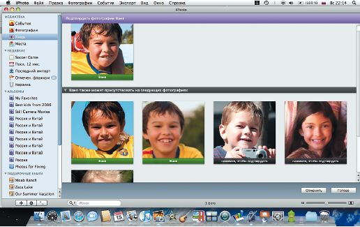 Эта функция, бесспорно, удобна. Например, вы хотите всегда иметь под рукой свои фотографии, чтобы при случае поместить что-то новенькое в «Одноклассники». Раньше вам пришлось бы вспоминать, когда и где вас удачно сфотографировали, и перелопачивать огромное количество папок. А теперь все просто: iPhoto умеет распознавать лица. Причем эта процедура автоматически запускается при импорте новых снимков в ваши альбомы. Конечно, чем фотографий больше, тем продолжительнее она будет. В результате iPhoto предложит вам познакомиться с обнаруженными на снимках изображениями людей и указать их имена. Достаточно опознать человека лишь на одной фотографии, чтобы программа сама показала вам похожие снимки. Разумеется, компьютер может ошибаться, и потому iPhoto представит вам все, похожие, по его мнению, снимки, чтобы подтвердить правильность выбора.