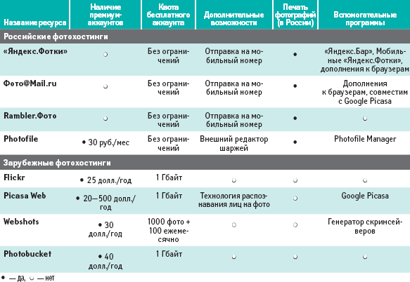 Российские сервисы выглядят более чем конкурентоспособно, они мало в чем уступают по возможностям зарубежным ресурсам и зачастую превосходят их по выбору бесплатно предлагаемых услуг. Все сервисы крупных порталов предоставляют бесплатные аккаунты неограниченных размеров. Весьма хорошие условия обеспечивает сервис «Яндекс.Фотки», а Фото@Mail.ru привлекает возможностью использовать онлайновый сервис в связке с менеджером Google Picasa.
