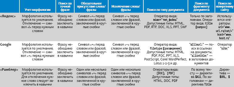 Целесообразно обращаться с запросами к поисковику, имеющему более полную базу индекса. О русскоязычном Web больше всего известно "Яндексу", который обнаружил уже более 3 млрд. страниц на русском языке и обрабатывает половину русскоязычных поисковых запросов. К сожалению, поисковый робот "Яндекса" довольно медлителен -- он обходит известные ему адреса примерно 2 раза в месяц. В то же время роботы Google (которые, кстати, на 11 лет моложе «Яндекса») за день анализируют до 8 млрд. страниц, правда, во всем Интернете и на всех языках. Поисковая машина «Рамблер» сейчас также достаточно компетентна в русскоязычном Интернете: у нее хороший стартовый каталог и быстрые роботы, обходящие известные ей сайты дважды в день. В общем, трех этих поисковиков достаточно, чтобы найти необходимые данные. Однако каждая поисковая система отличается своими особенностями при обработке запроса, и их следует учитывать при поиске.