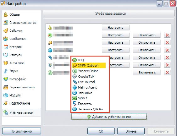 Рассмотрим ввод параметров учетной записи в популярных клиентских программах. Чтобы «подружить» QIP Infium с Jabber, откройте меню «Настройки > Учетные записи > Добавить учетную запись» и в списке протоколов выберите XMPP (Jabber). Полагаем, ввод логина и пароля для вас не составит труда. После этой процедуры в нижней части окна QIP Infium появится значок протокола. При использовании Pidgin данная процедура еще проще: при первом запуске «пингвина» нужно выбрать протокол и указать логин с паролем.