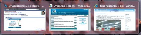Теперь для сворачивания всех открытых окон вместо привычного многим значка освобождения Рабочего стола используется специальная «педалька» Peek -- маленькая, никак не обозначенная клавиша в правом нижнем углу экрана. Если не знать заранее, что она существует, придется потратить уйму времени на поиски. При наведении на нее указателя мыши всплывает надпись "Show Desktop". Это не упрощение и не усложнение -- просто другой способ работы, обусловленный сменой всей методики в целом. Если окна на Рабочем столе расположены каким-то особым, необходимым в определенный момент образом, то нужно просто навести на «педальку» курсор мыши, и в результате станет виден Рабочий стол с наложенными поверх него контурами открытых окон.