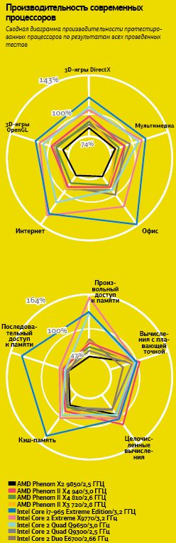 Нельзя забывать и о том, что процессоры были протестированы с различной оперативной памятью — DDR2 либо DDR3. В большинстве случаев ее влияние ограничивается величиной в несколько процентов и эквивалентно изменению на одну «ступеньку» тактовой частоты процессора, обычно составляющей около 200 МГц. Поэтому, кстати, в большинстве тестов результаты, показанные Phenom II 720, ближе к продемонстрированным Phenom II 940, чем Phenom II 810. Флагманский процессор AMD работает с более низкочастотной памятью.