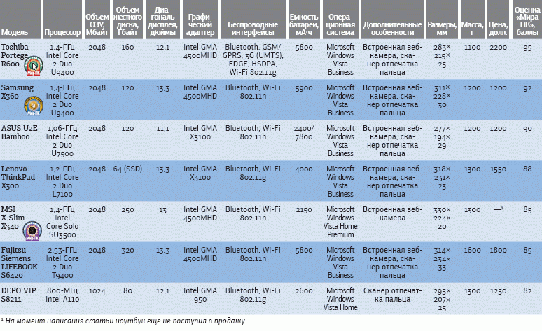 Признаться, на сей раз при подведении итогов мы решили немного отступить от привычной системы оценок, приоритетом которой всегда была производительность. Дело в том, что в данном случае нас интересовали не игровые возможности рассматриваемых малышей, а скорее максимальная функциональность при минимальной массе. Ведь пользователь, приобретает ультрапортативный ПК, чтобы постоянно носить с собой, причем, как правило, на собственном плече. Именно поэтому «Выбор редакции» пал на Toshiba Portege R600, а вот «Лучшей покупкой» мы посчитали Samsung X360 — несмотря на некоторые недостатки, этот ноутбук обладает отличной функциональностью при весьма привлекательной цене. «Лучший дизайн» достался ноутбуку MSI X-Slim 340.