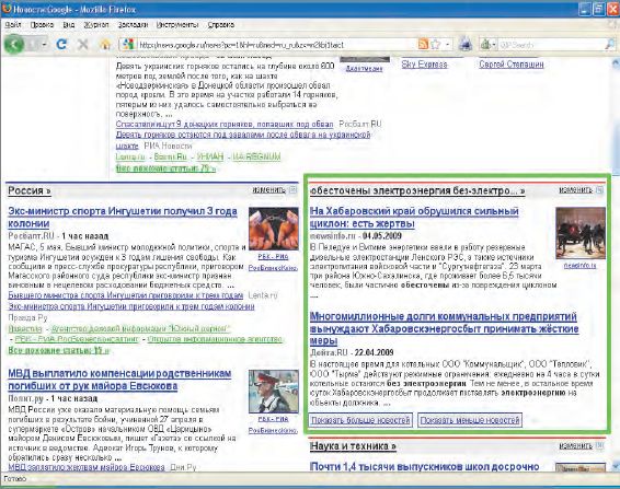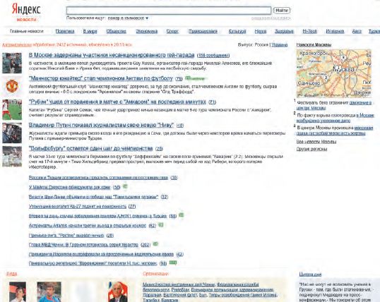 Об этом позаботились создатели поисковых систем, реализовавшие возможность поиска в новостях, т. е. по наиболее распространенным новостным ресурсам. Например, «Яндекс», Google и «Рамблер» предлагают специальные новостные сервисы, где представлены тематические информационные ленты. Как правило, они формируются автоматически, из информации, предоставляемой новостными интернет-агентствами. И разумеется, пользователи могут осуществлять поиск интересующих сведений только по содержимому этих новостных лент.