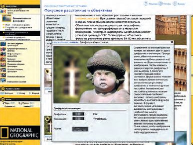 Наверное, не стоит говорить, что весь курс богато иллюстрирован фотографиями и видеороликами… А одно из наиболее впечатляющих достоинств диска — возможность просматривать фотоматериалы в увеличенном практически на весь экран виде. (Увы, иногда о таких «мелочах» разработчики почему-то забывают.) Кроме того, стоит отметить «виртуальную камеру», позволяющую увидеть, какой результат дает «игра» с установками баланса белого, как зависят друг от друга диафрагма и экспозиция, как меняется изображение в зависимости от удаления и фокусного расстояния.